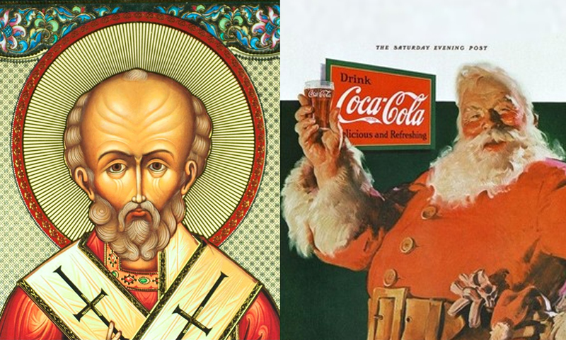 ▲左圖為「主教聖尼古拉」,右圖為1931年可口可樂請Haddon Sundblom繪製的聖誕老人。
