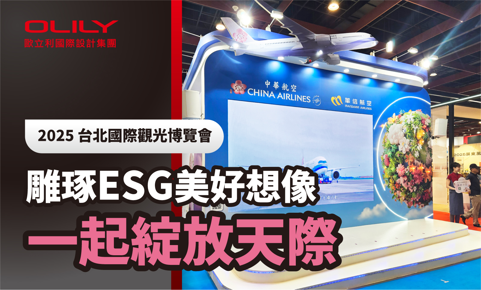 2025年,中華航空以【ESG 永續華航】為品牌核心,持續以飛行連結世界、以行動守護地球。歐立利國際設計集團有幸承接三大專案——兩場國際旅展【台北國際觀光博覽會】與【台北夏季旅展】,以及【績優代理商感恩晚會】——將華航的 ESG 精神轉化為動人的品牌故事,讓永續理念以設計語彙綻放。