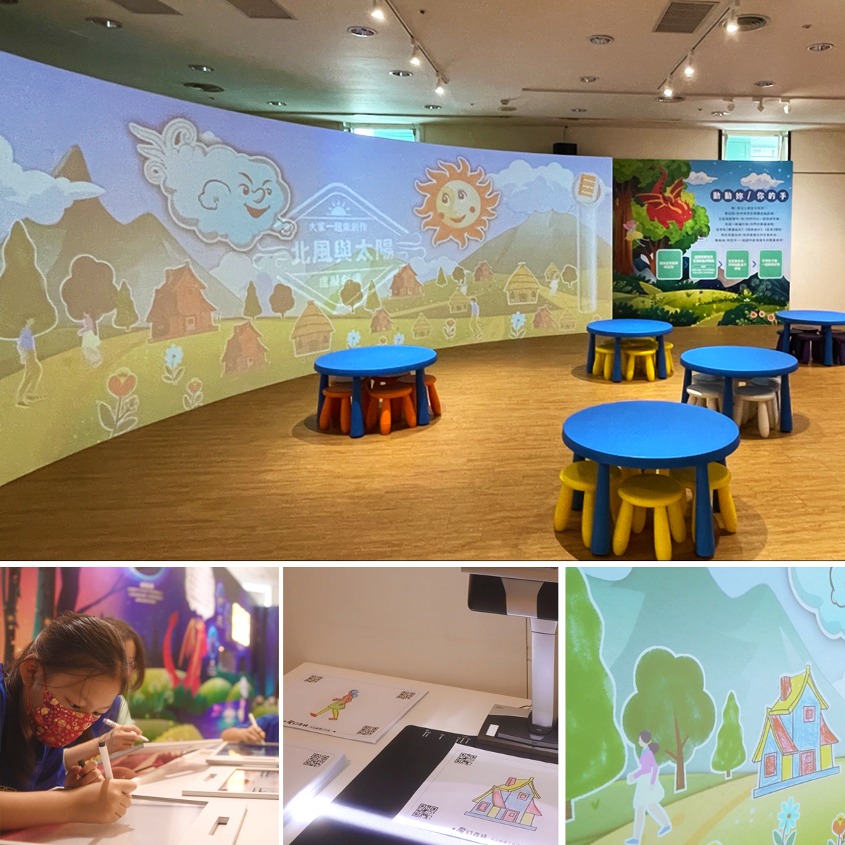4樓的『大家一起來創作』區域,歐立利團隊以「北風與太陽」故事為基底,讓兒童透過集體討論方式,共同創作出屬於他們自己的故事結局。參觀兒童透過畫畫的方式,將自己設計的服裝和佈景道具等投影到7米寬的投影牆面,充分體現劇場合作共創的美好精神。