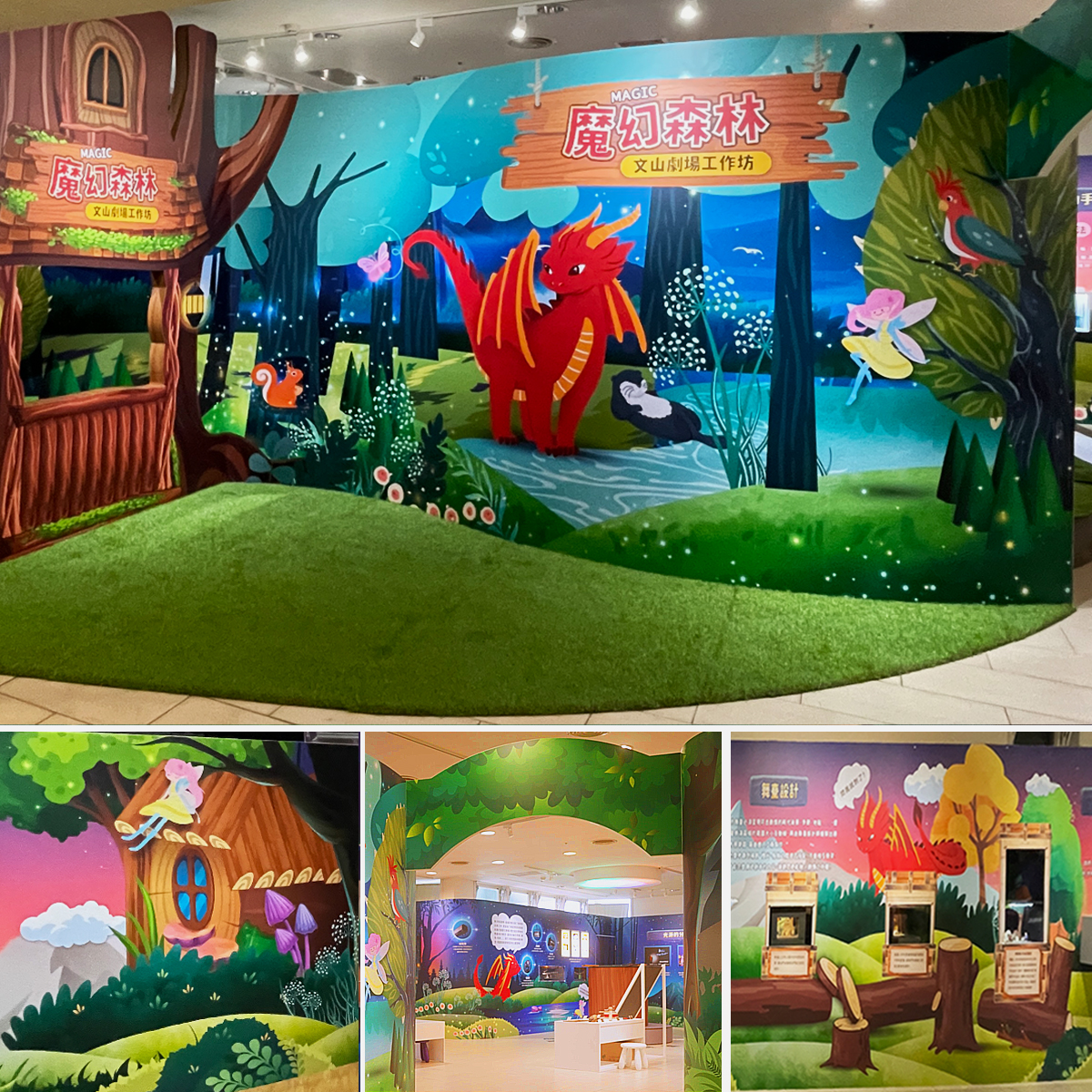 一進入場館就感受到魔幻的氛圍,參訪兒童融入在有小火龍、小精靈及小動物們的森林場景中,也可從樹洞中探出頭來當個劇場售票員,讓參觀者在充滿童趣的入口處就開始期待劇場幕後工作的展覽介紹。此處也提供來訪參觀者最佳的拍照打卡點。