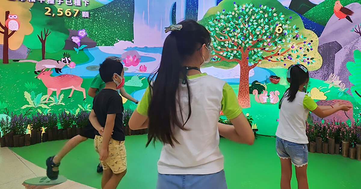 體感遊戲創意發想自佛法種⼦,民眾在時限內接住樟樹掉落種子,澆灌後長成小樹苗,為森林萬物建築家園,最終種子數量成為集體共創成果。