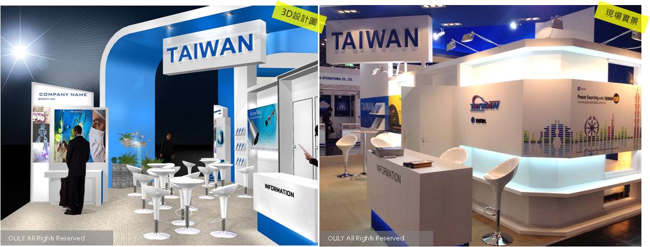 首先看到在台灣館的「聯合攤位及貿協接待區」的主體設計上,歐立利突破