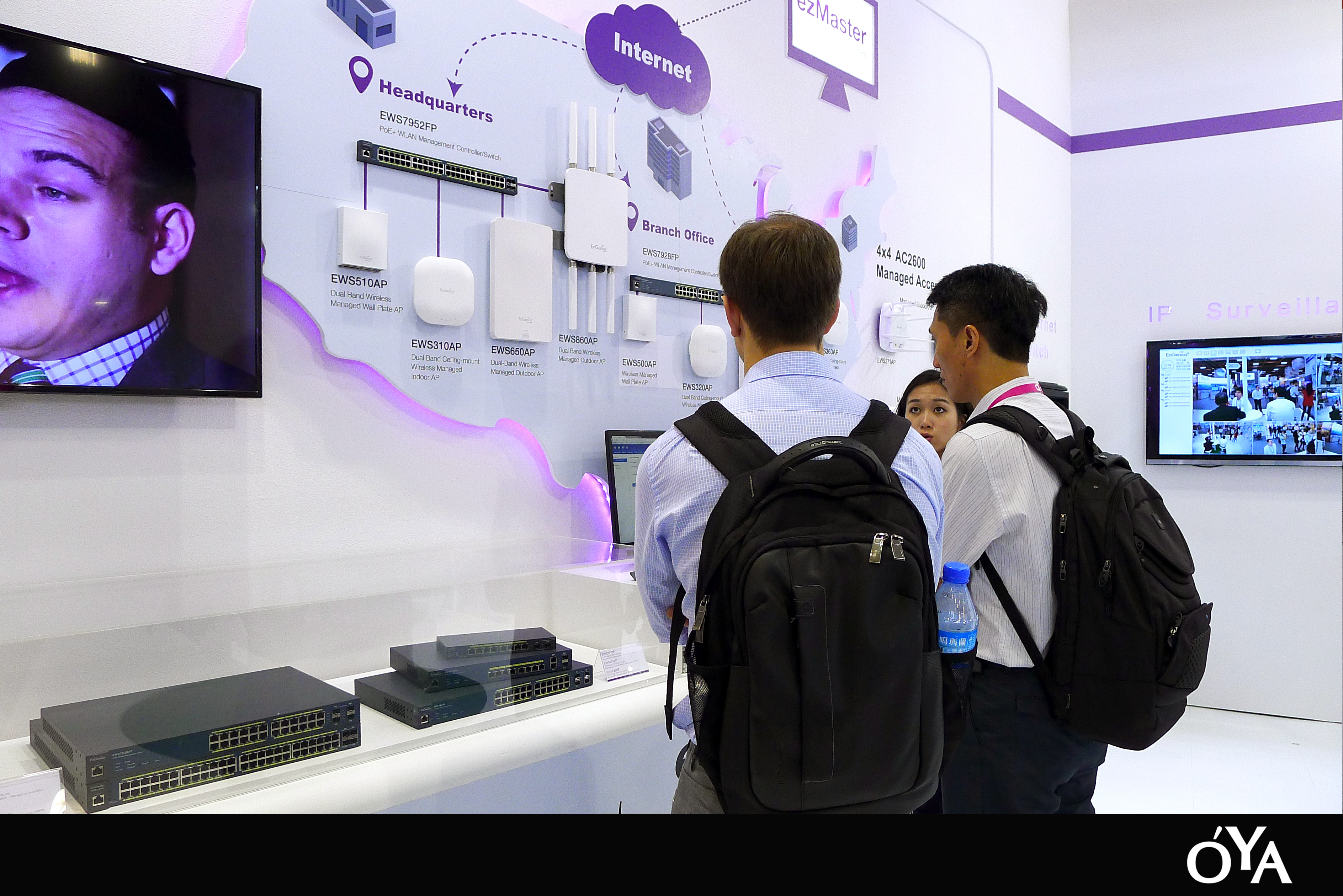 在另一間網通科技廠商的攤位上,歐也空間運用浮雲及網絡概念的結合,呈現流動的視覺感受,以襯托旗下無線通訊網路產品的速度與順暢印象。