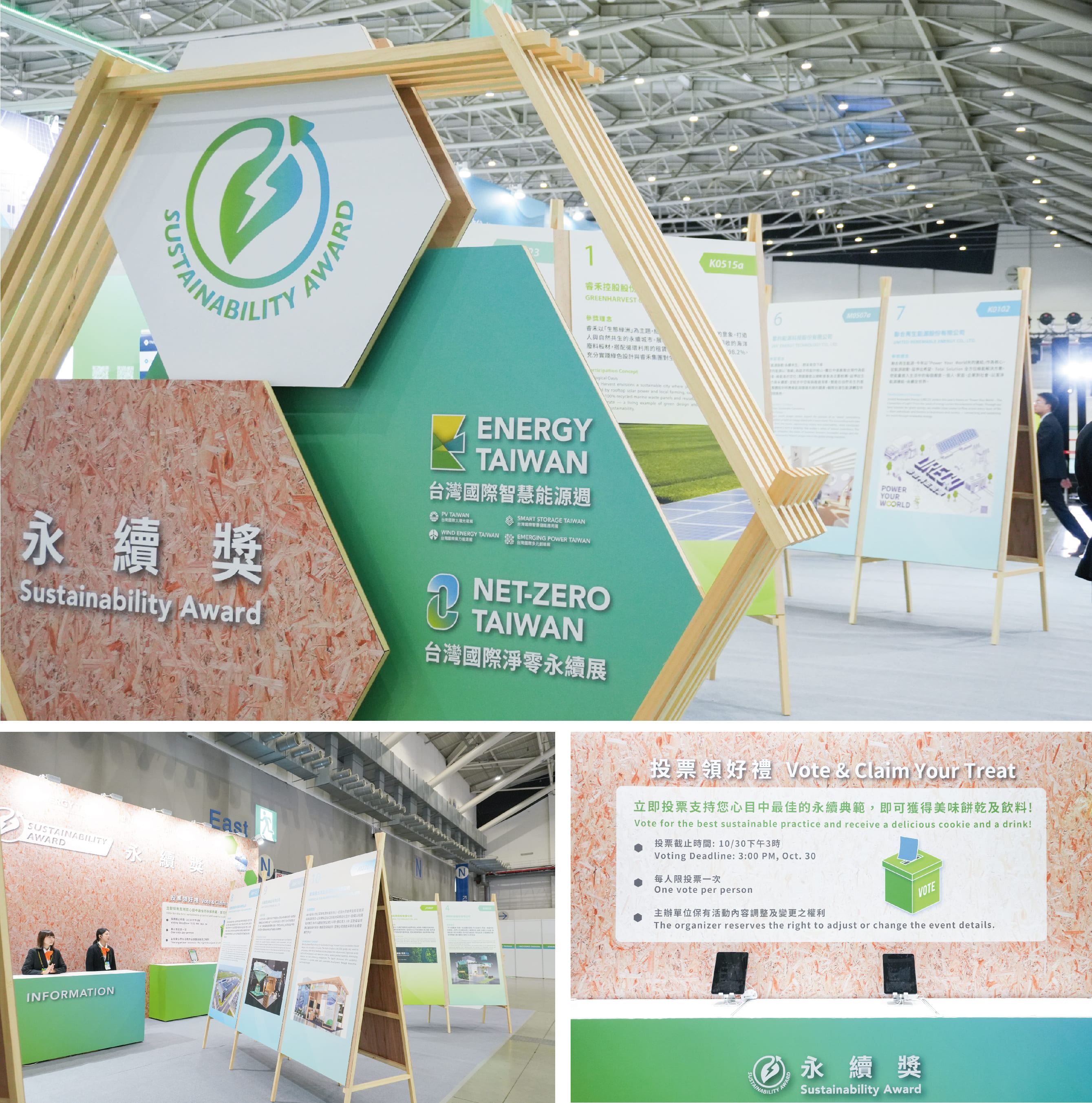廣受各界好評的「永續獎」邁入第四屆,在永續展專區,歐也運用角材元素搭建六邊形裝置,象徵全方位守護的永續精神,在此區民眾可以看到綠能產業的創新成果,並投票選出心目中最喜愛的永續展位,一同響應永續。