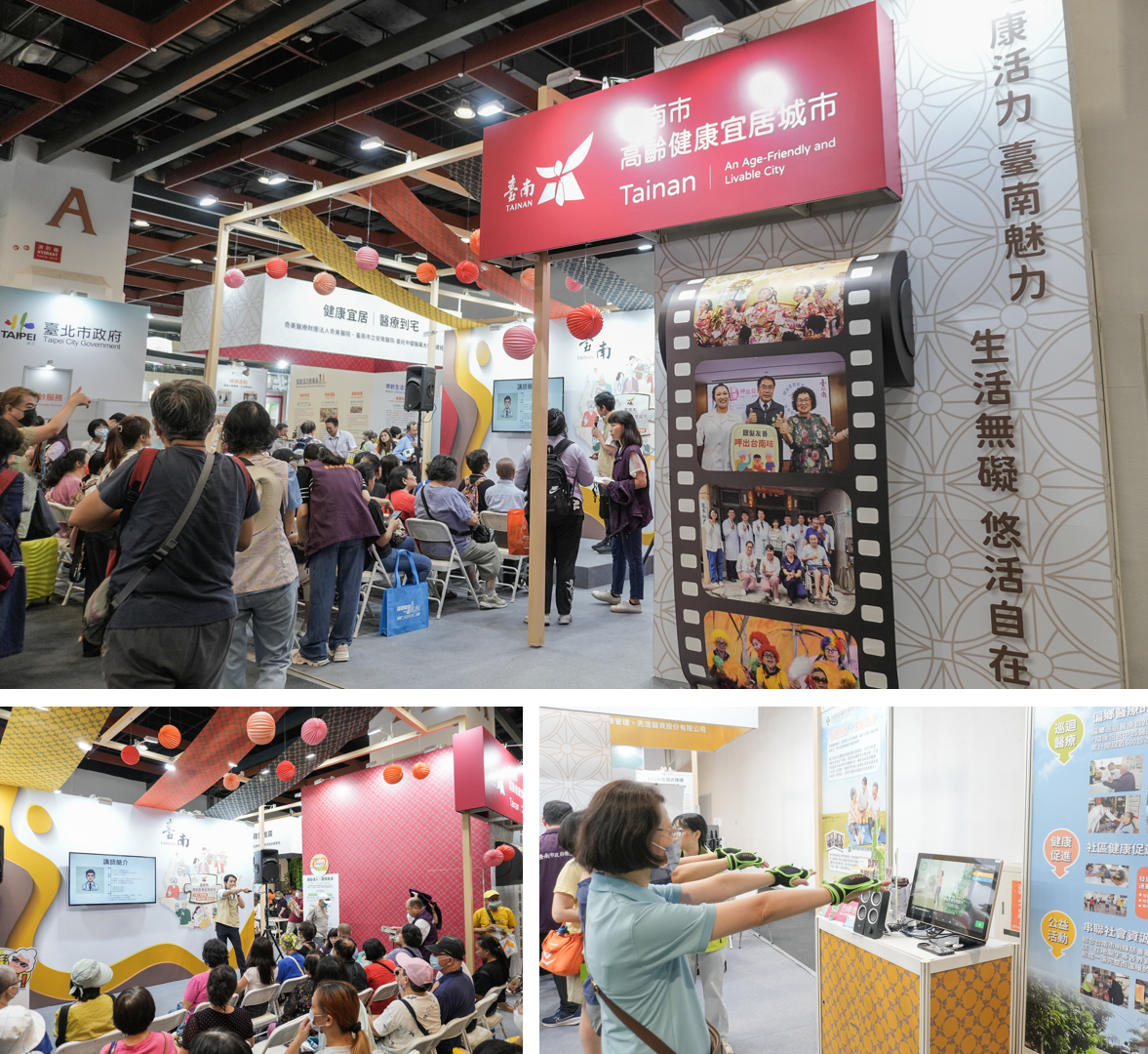 文化古都台南,是適合長者移居的友善城市之一,今年台南市政府主題館全方位展出豐碩的成果,推出醫療到宅、社區守護、智慧照護等服務,舞台區三天都安排滿滿的預防保健講座跟健康互動遊戲,靜態展區也設計各式趣味遊戲與檢測體驗,帶領參展民眾近距離感受台南的健康活力與幸福魅力。