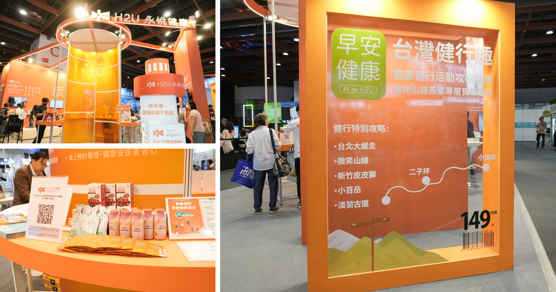 H2U永悅健康一直相信「健康」不是被動接受照護,而是積極出擊所選擇的生活方式,並以「青春尚趴」為主題,將新生活型態醫學的理念推廣給民眾,像是在社群發起健行尋寶的活動,鼓勵熟齡族透過健走維持活力;展區以品牌活力橘為主調,能量塔串聯六大區,展現清新時髦的品牌形象。