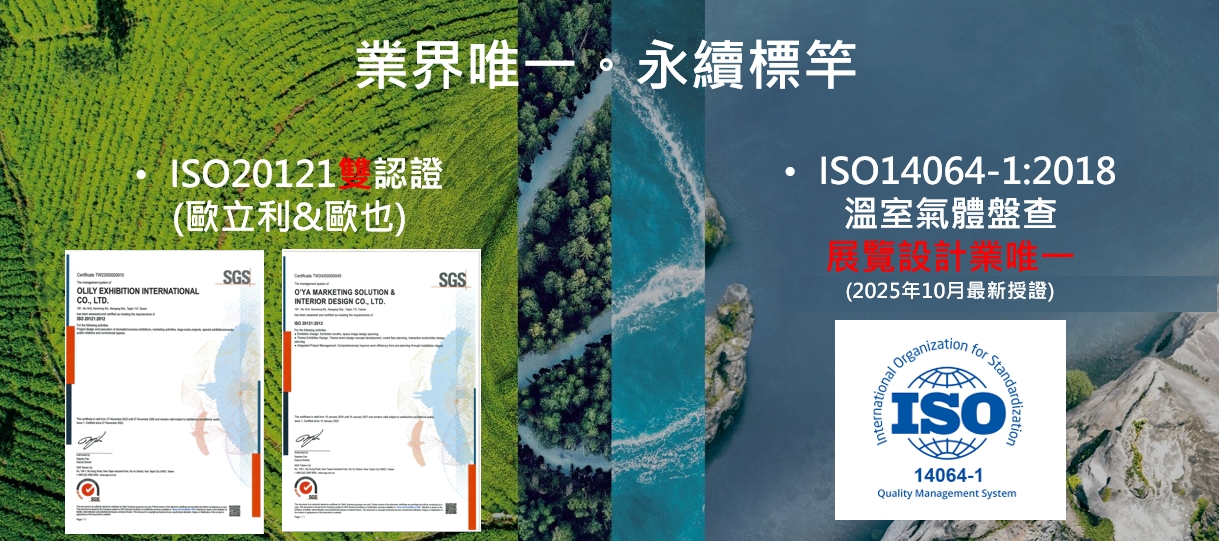 歐立利國際設計集團永續策略長張儷瀞表示:「我們的核心客戶幾乎主動要求導入永續設計,這已從『加分題』轉變為『國際參展的必答題』。」歐立利為業界唯一通過「ISO 20121永續活動管理系統」與「ISO 14064-1:2018溫室氣體盤查」雙認證的展覽設計企業,擁有「永續展覽先行者」的稱號,建立從設計、材料、運輸到施工的完整碳排盤查流程。