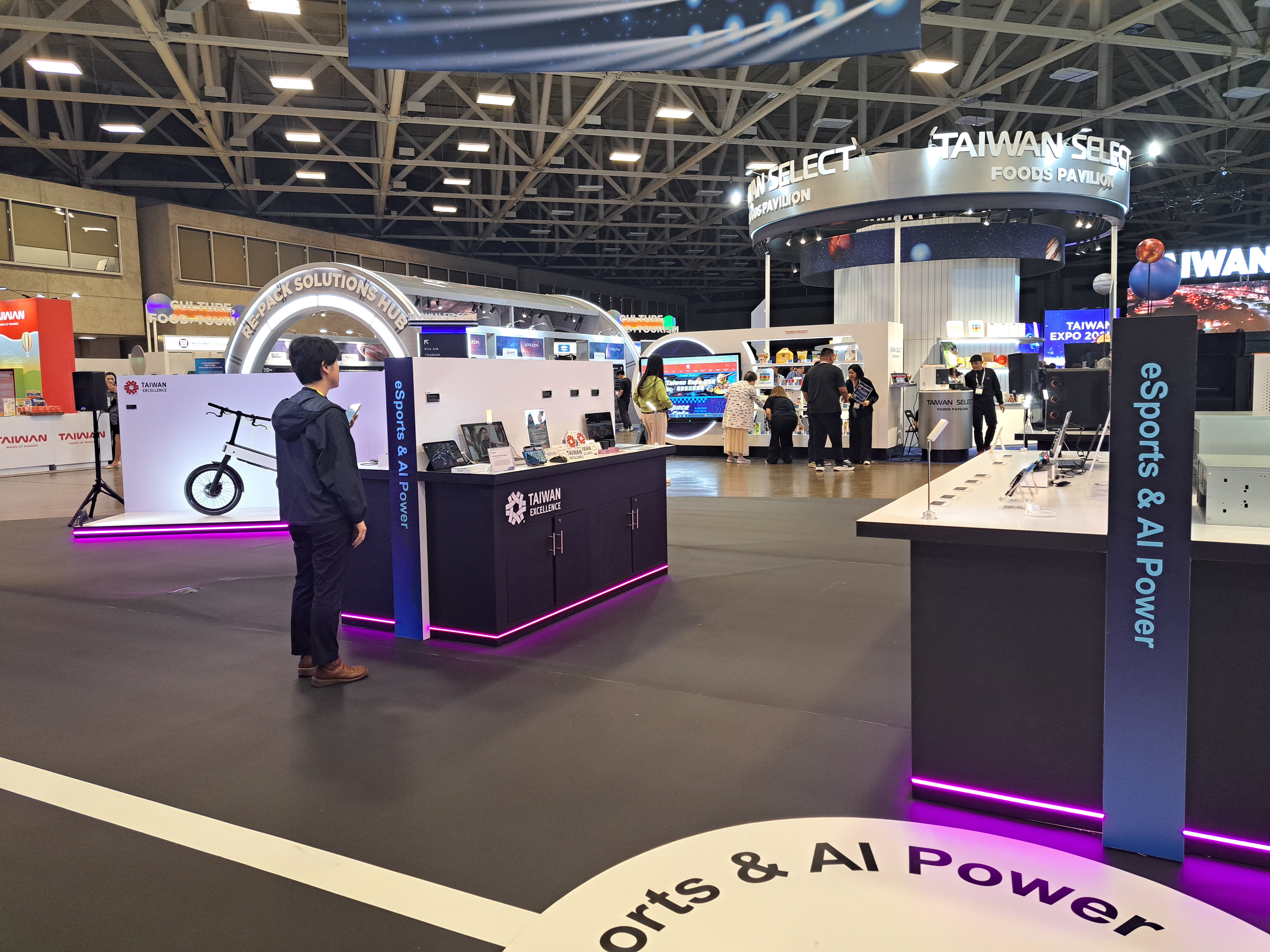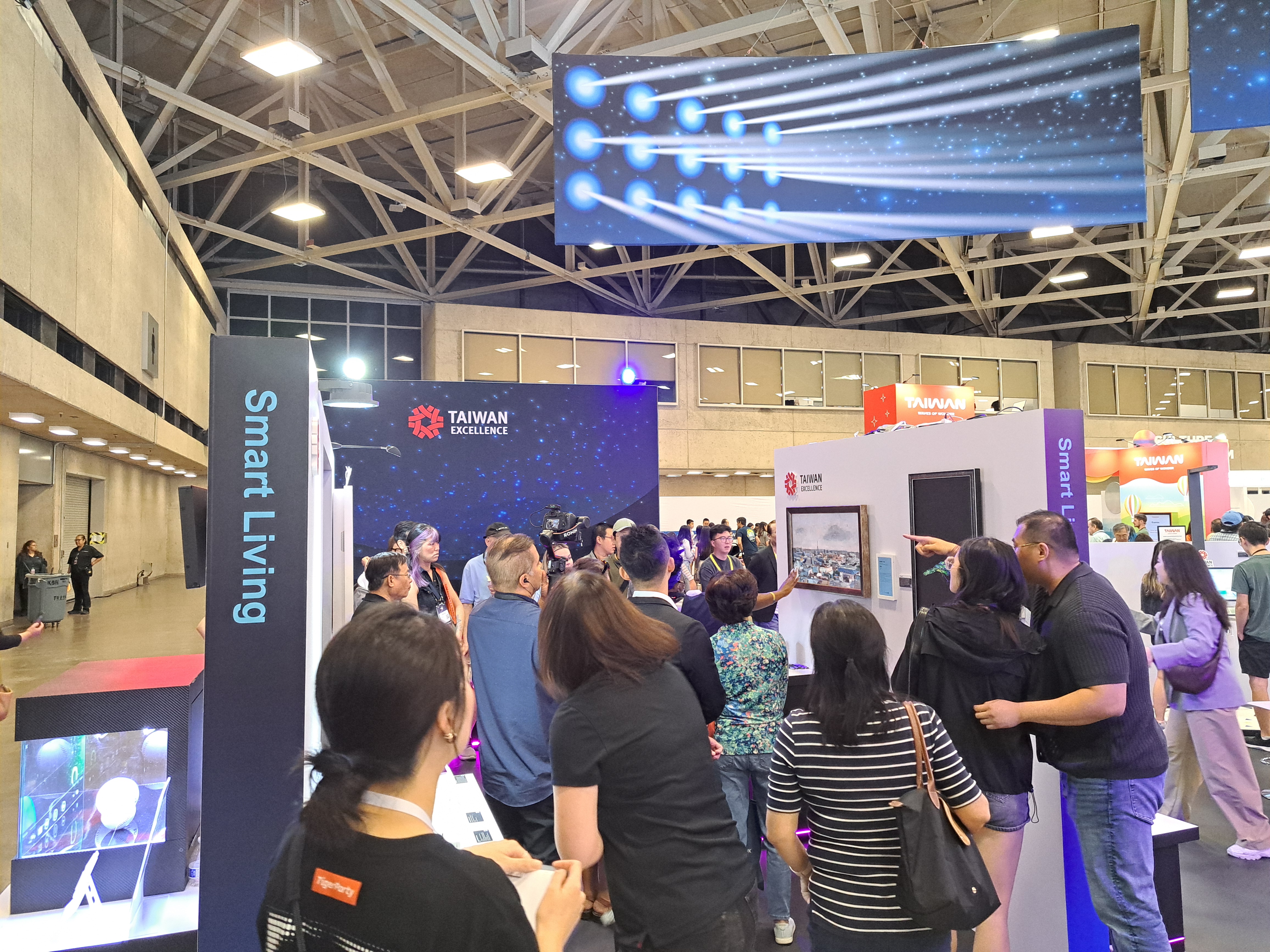 展台側邊以清楚的主題標示與星際漸層色系呈現,使買主更容易辨識展品類別,有效提高停留與洽談機會。