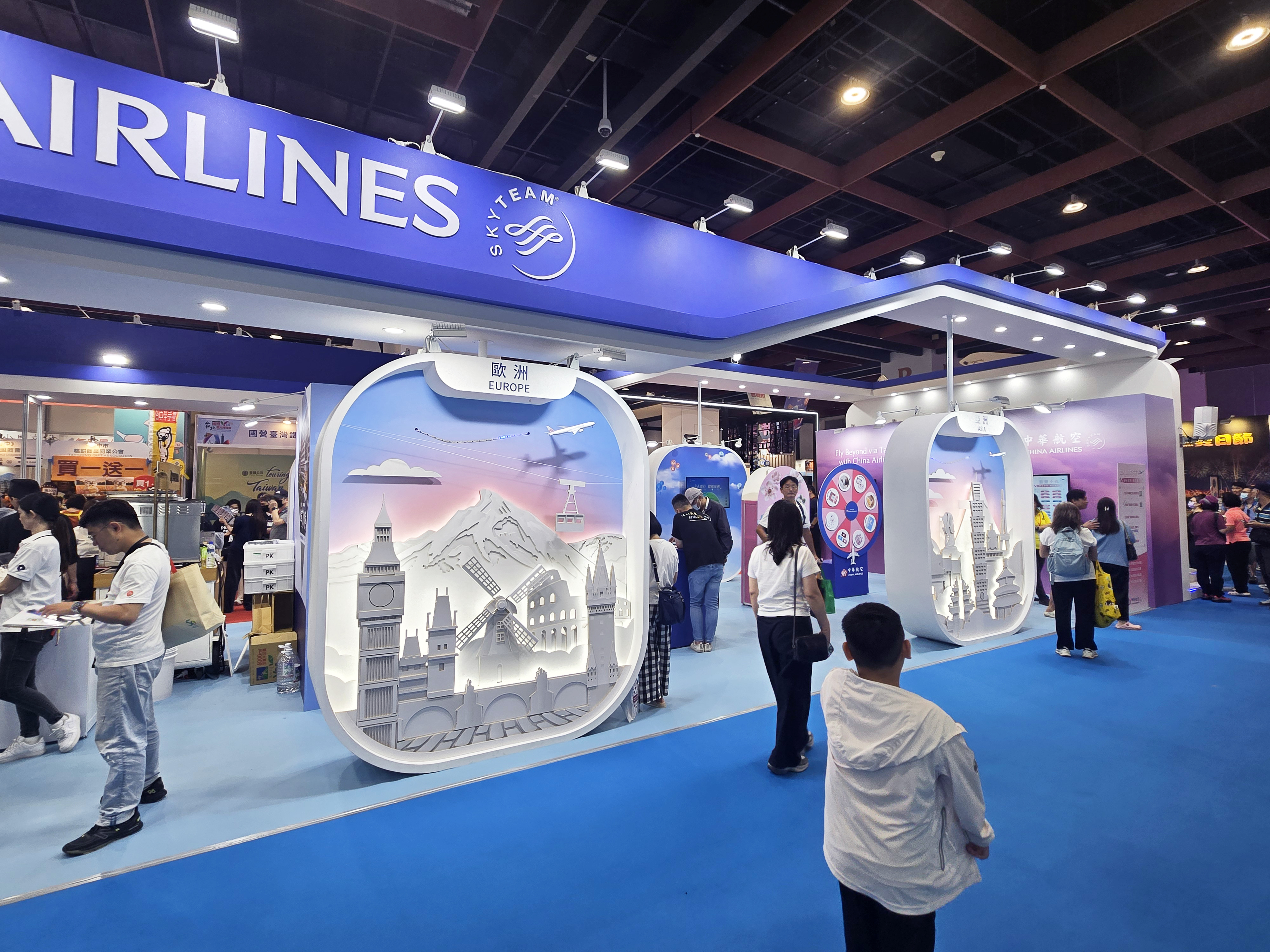攤位門楣以優雅弧線象徵飛機起飛、繞行世界,寓意華航與旅客迎向永續未來。下方延伸至「四大洲國際航線紙雕牆」,以細膩光影與層次展現華航守護地球、關懷世界的旅程。