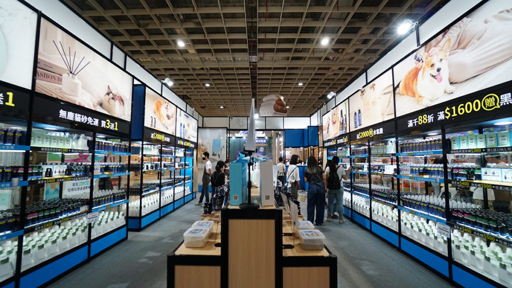 空間以兩條走道貫穿,讓飼主方便以推車攜帶寵物進場,寬敞走道容納多人選購,即使牽繩遛寵物也不受影響,展區外大面積透版設計,加上整齊商品陳列,吸引飼主入內選購。